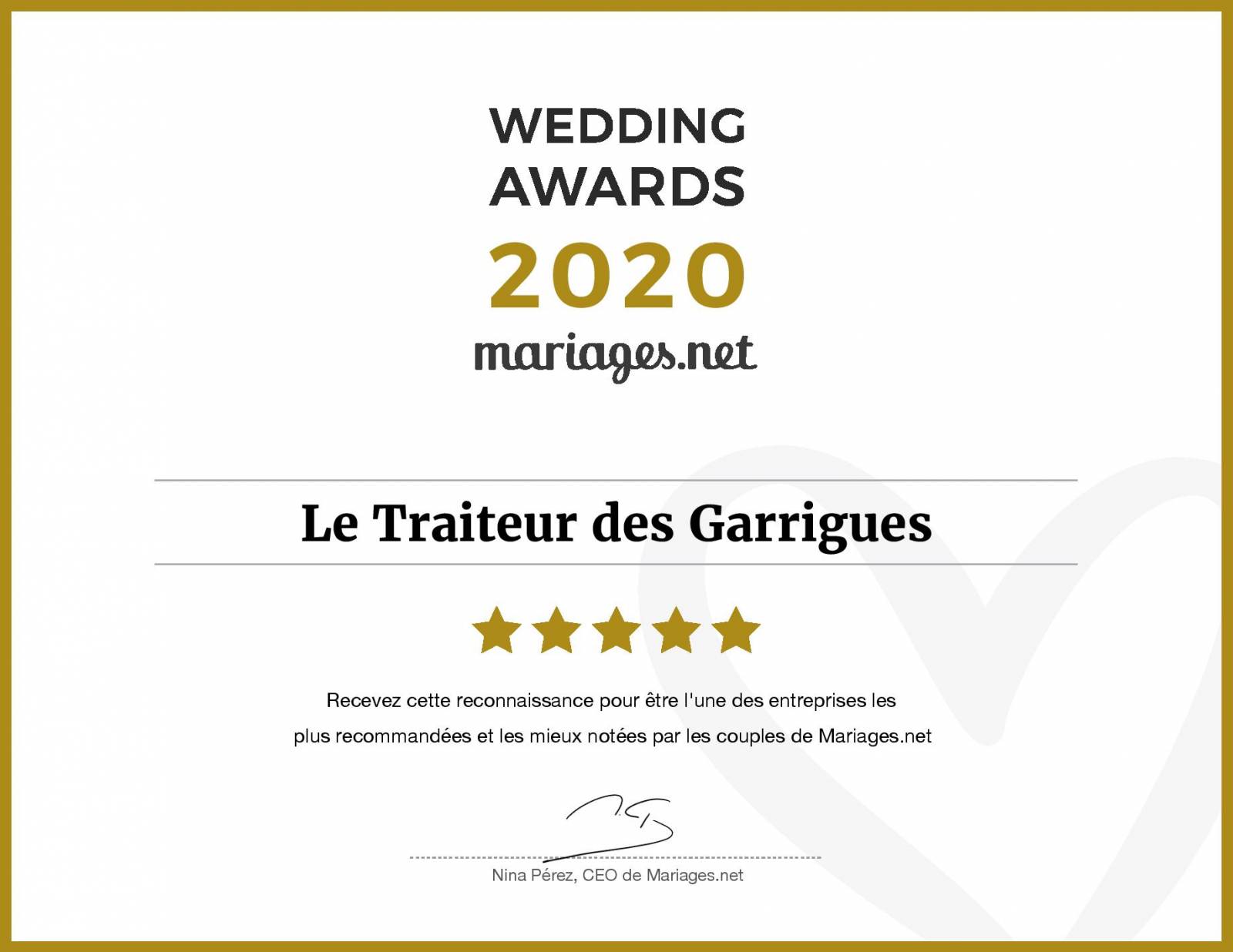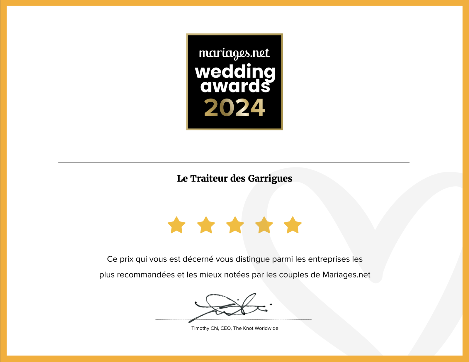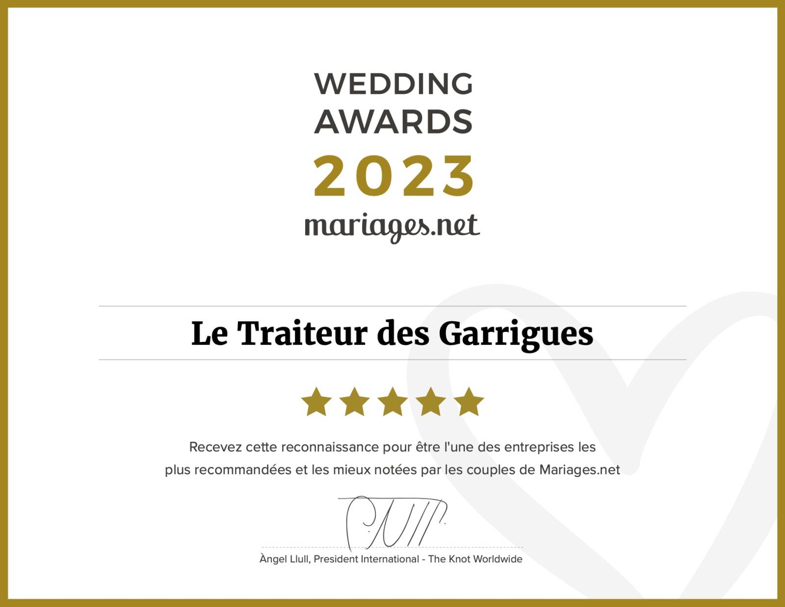Le Traiteur des Garrigues a reçu le prix du Wedding Awards 2024, la récompense la plus prestigieuse du secteur nuptial dans la catégorie Traiteur. Depuis cinq ans, Mariages.net décerne ces prix qui reconnaissent l’excellence du service offert par les entreprises du secteur nuptial en France, mais ce sont les couples qui rendent cette remise de prix possible grâce aux avis publiés après avoir bénéficié des services des professionnels du mariage. Les Wedding Awards sont devenus une référence et un critère de choix pour les couples qui organisent leur mariage notamment lors du choix des prestataires qui participeront à leur grand jour.