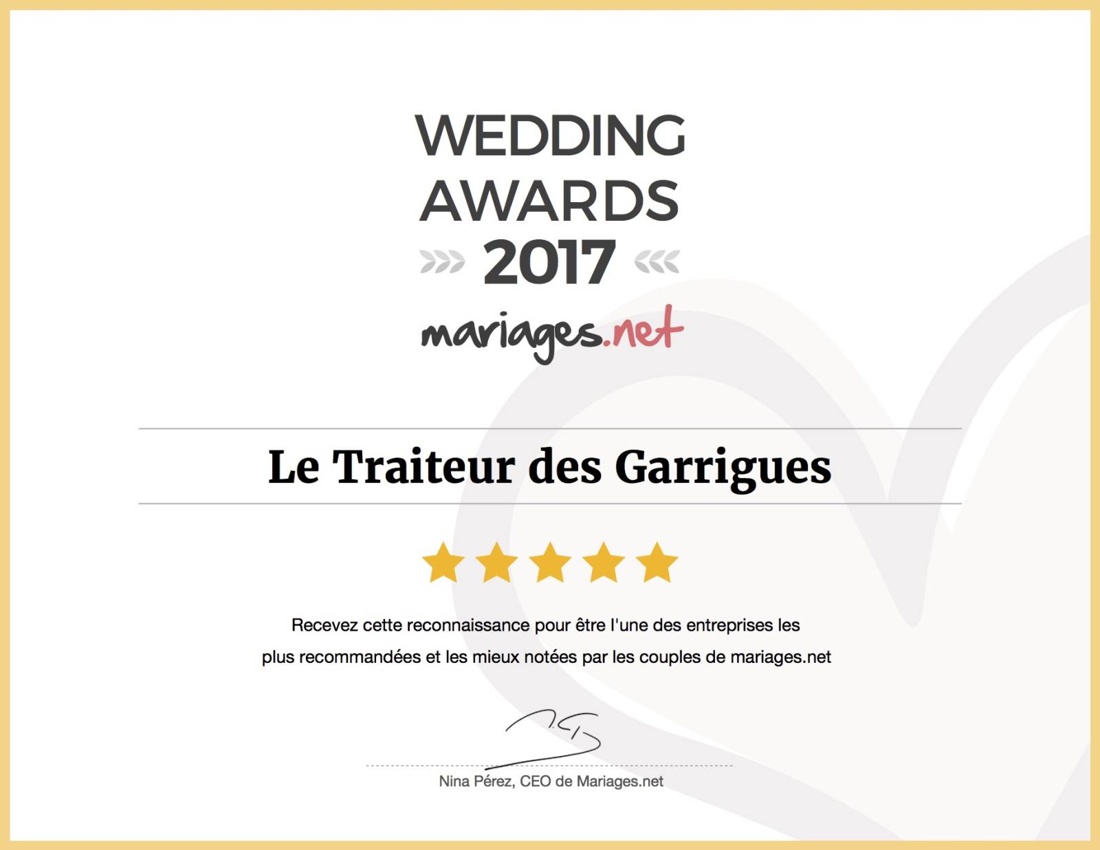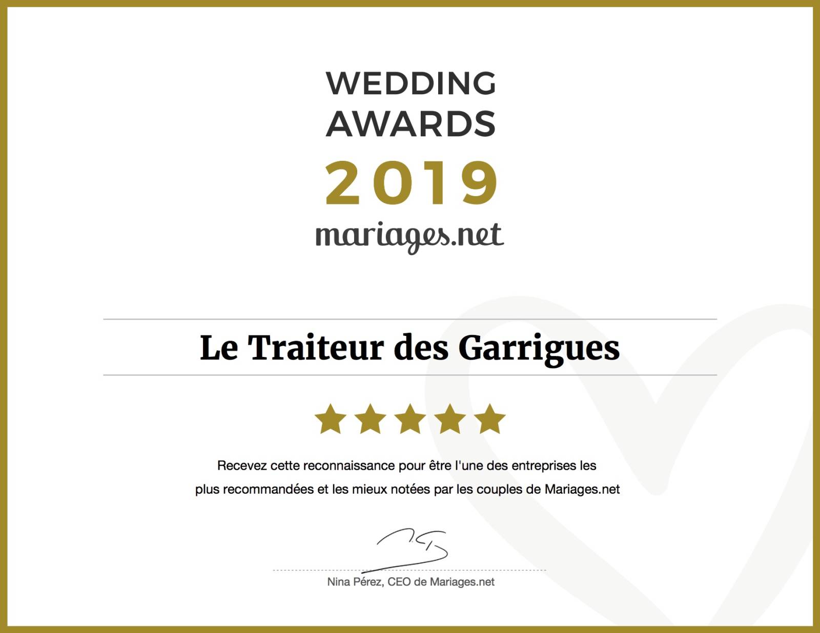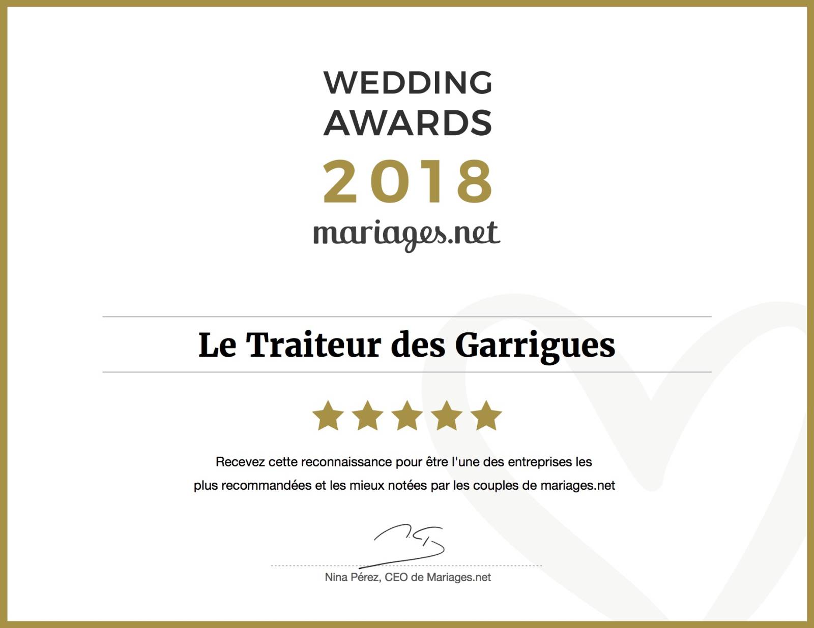 Le Traiteur des Garrigues a reçu le prix du Wedding Awards 2024, la récompense la plus prestigieuse du secteur nuptial dans la catégorie Traiteur. Depuis cinq ans, Mariages.net décerne ces prix qui reconnaissent l’excellence du service offert par les entreprises du secteur nuptial en France, mais ce sont les couples qui rendent cette remise de prix possible grâce aux avis publiés après avoir bénéficié des services des professionnels du mariage. Les Wedding Awards sont devenus une référence et un critère de choix pour les couples qui organisent leur mariage notamment lors du choix des prestataires qui participeront à leur grand jour.