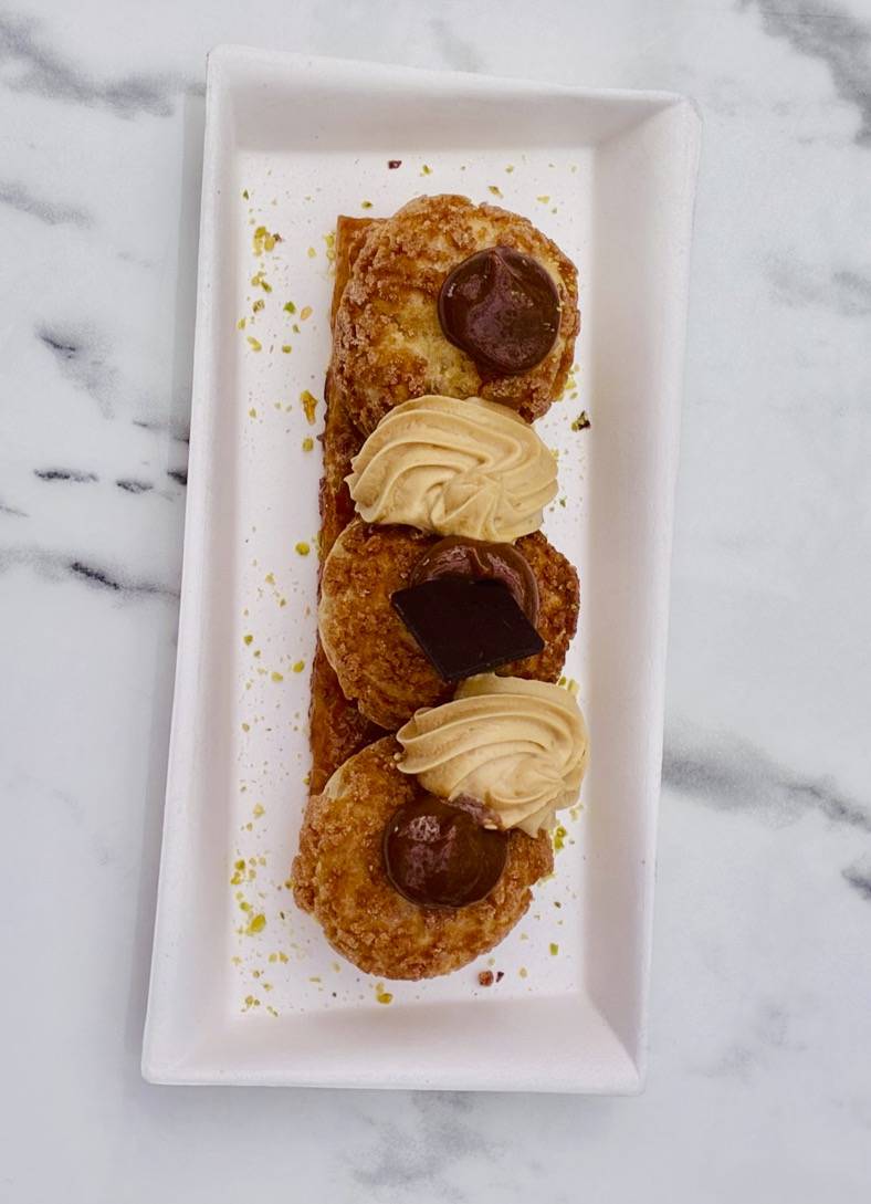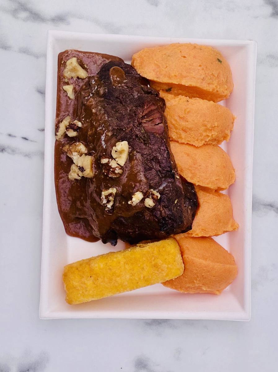 Vous pouvez déguster notre plateau repas de fête en entrée Feuilleté garni aux crevette et cabillaud . Le plat chaud Joue de boeuf cuisinée en confit et son Gratiné de butternut au châtaigne, avec un lingo de polenta . La sélection du fromager produits de nos terroirs et en dessert un financier revisité.