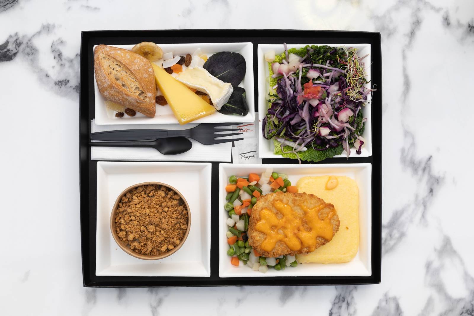 Tous nos plateaux sont livrés avec un kit 6 en 1 : fourchette, couteau, sel et poivre