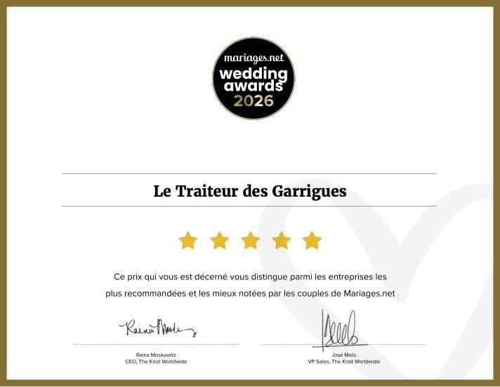 Choisir Traiteur des Garrigues, c’est faire le choix d’un traiteur primé, passionné et engagé, pour un mariage à votre image, élégant et mémorable.